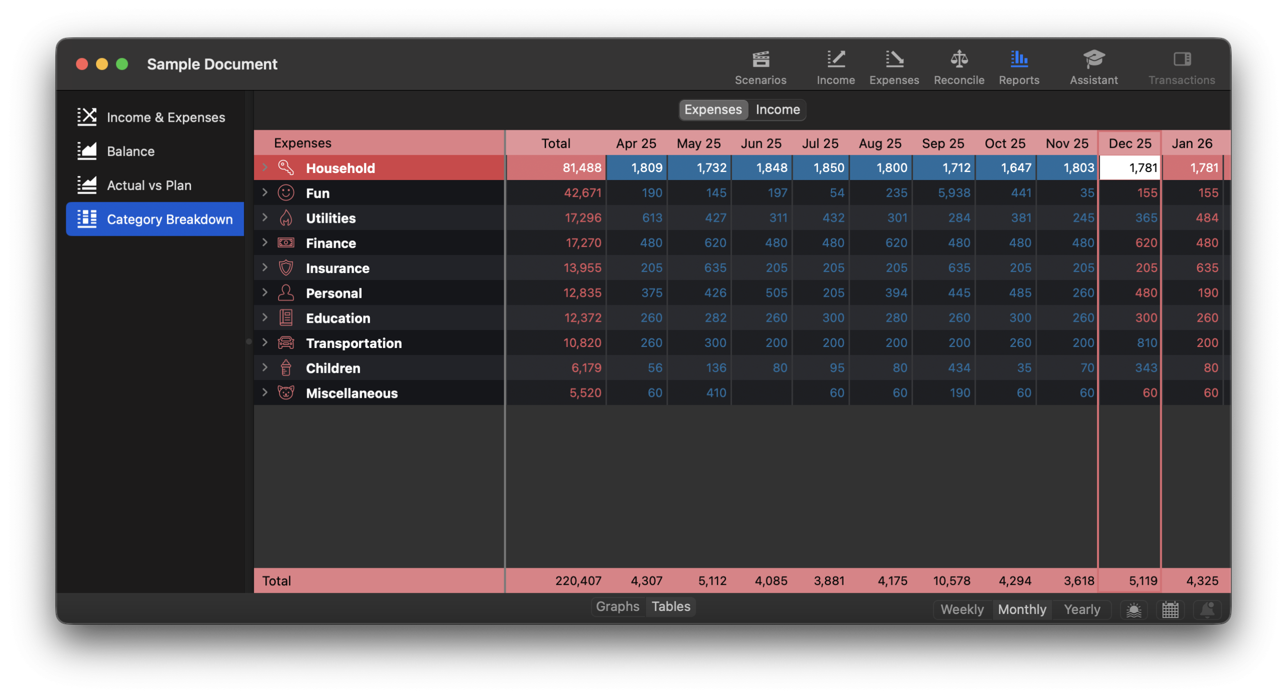 Prefer exact numbers to visual patterns? Click the table view to see the same data in spreadsheet format. Categories are sorted from highest to lowest total, so you immediately see where most of your money goes. It’s similar to Combined view in Income/Expenses screens but the categories are sorted and it shows totals for each row. It also behaves a bit differently with regards to navigating to subcategories.