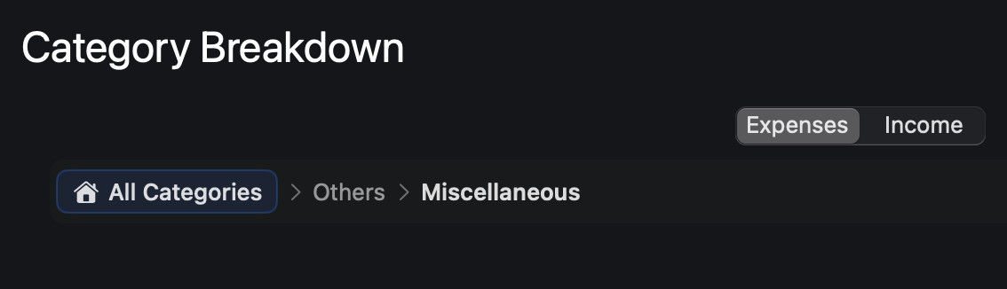 Breadcrumbs at the top track your navigation, you’ll see something like “Expenses › Transportation.” Press ⌘↑ or click the home icon to return to the top level anytime.